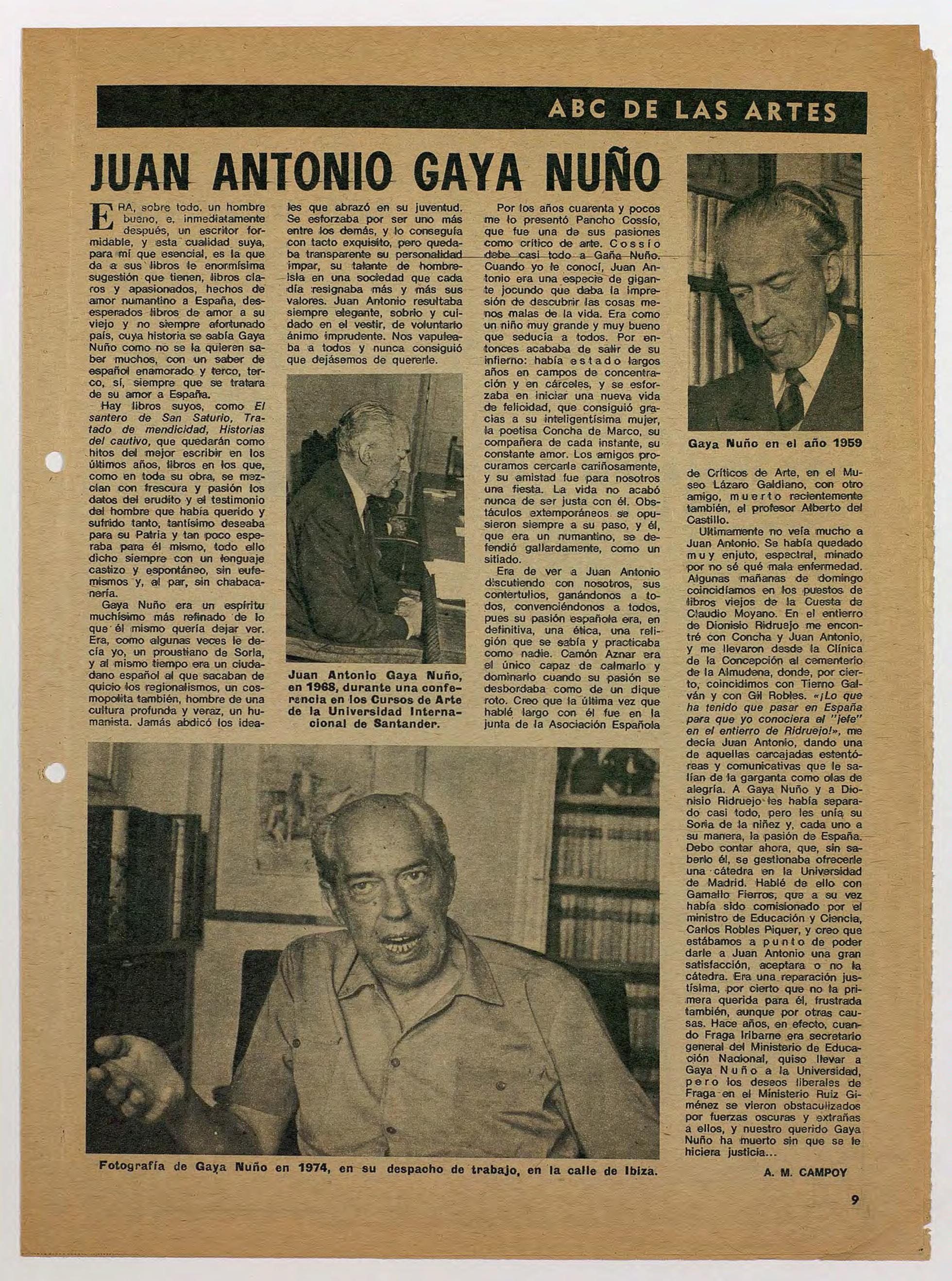 Recorte de ABC de las Artes, pág. 9 sobre Juan Antonio Gaya Nuño, después de la fecha de su fallecimiento el 6 de julio de 1976.