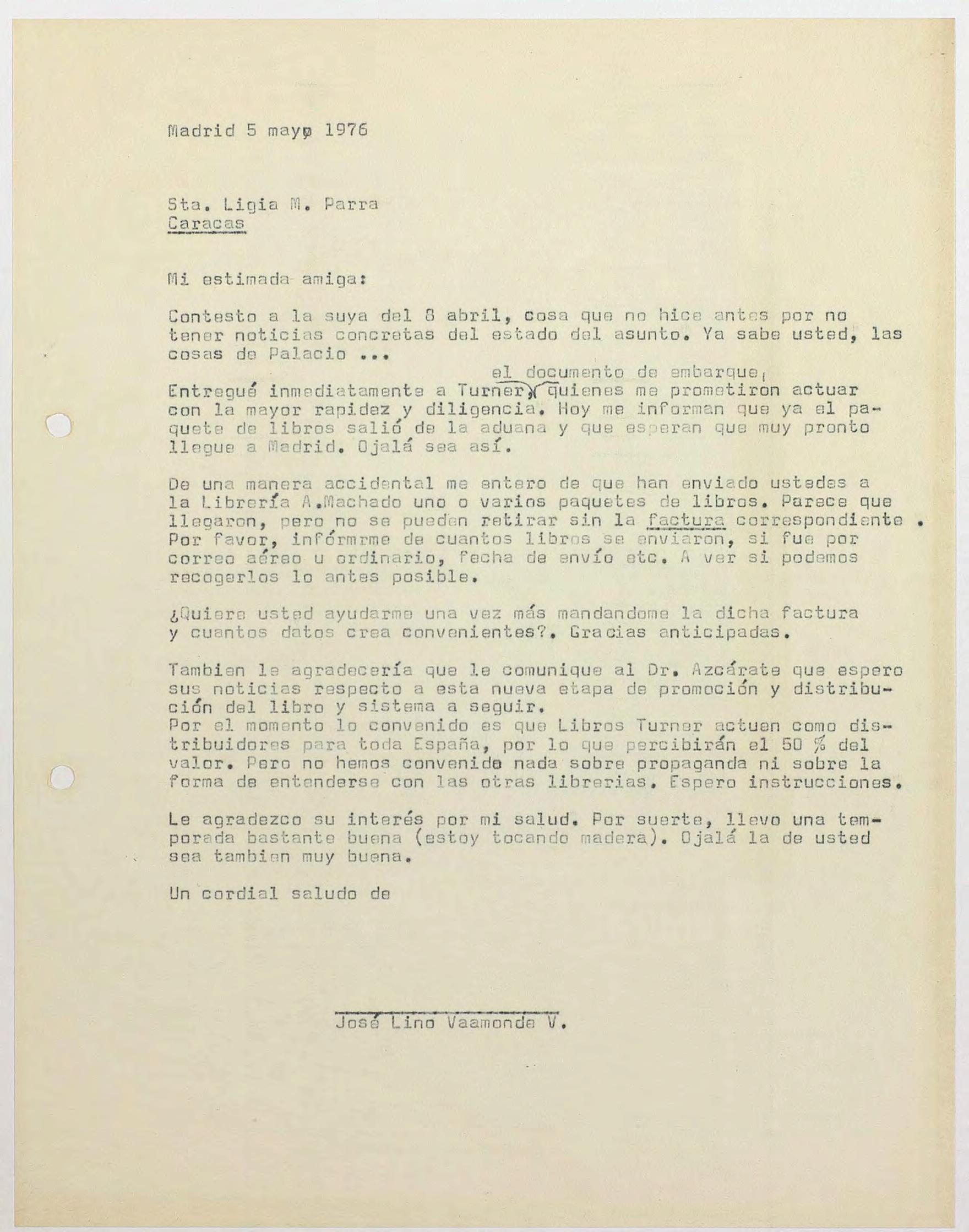 Copia de carta mecanografiada remitida por D. José Lino Vaamonde V. a la Srta. Ligia M. Parra.