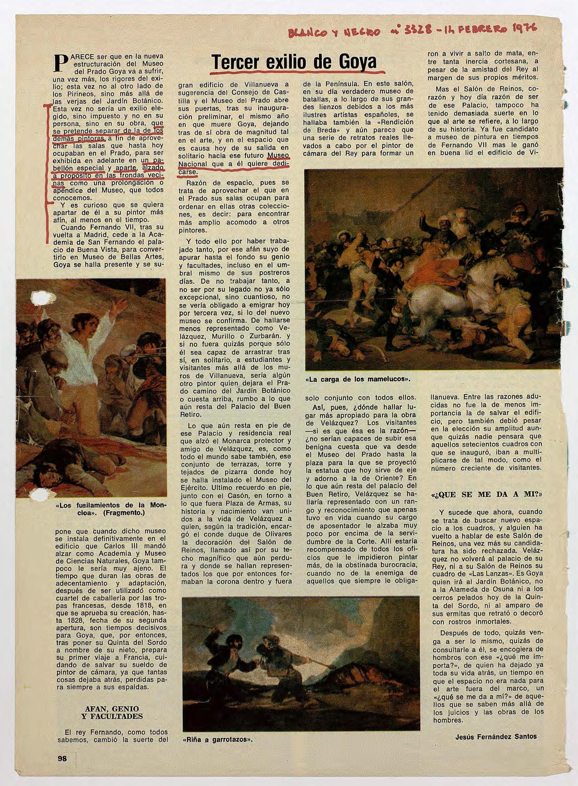 Artículo de Jesús Fernández Santos titulado "Tercer exilio de Goya", publicado en Blanco y Negro nº 3328.