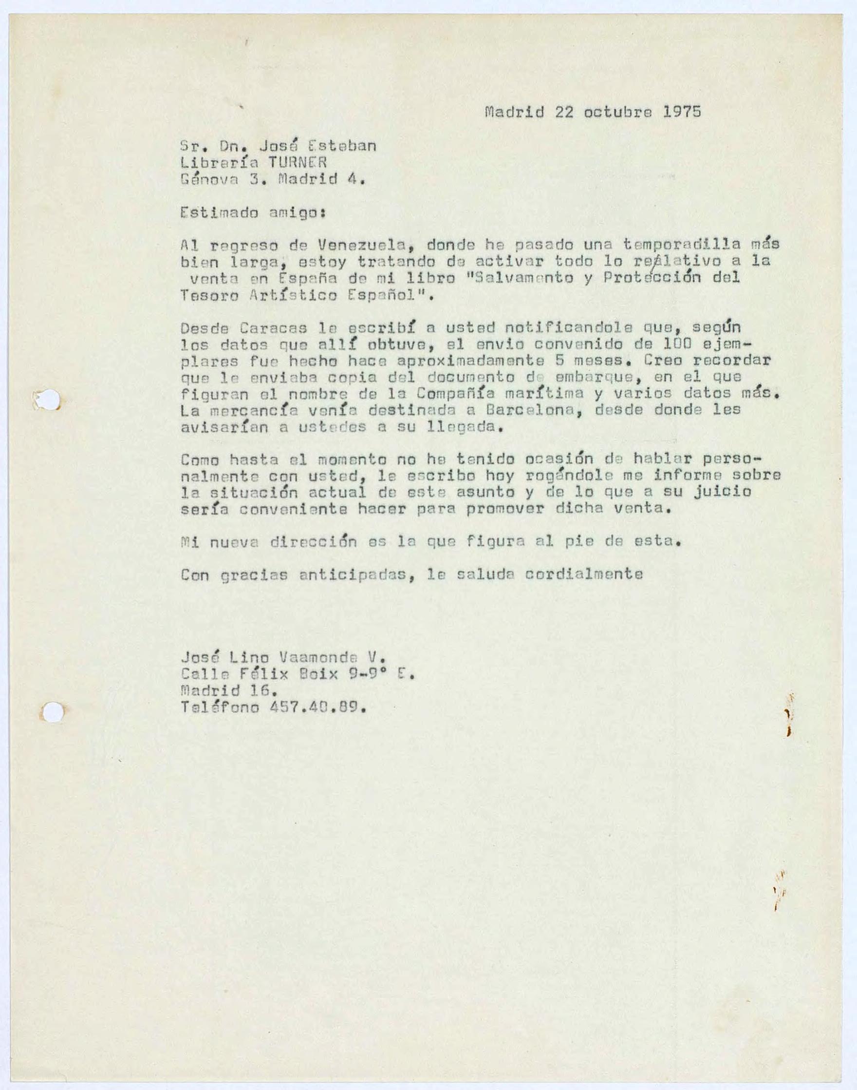 Copia de carta mecanografiada remitida por José Lino Vaamonde dirigida a D. José Esteban de la Librería Turner de Madrid.