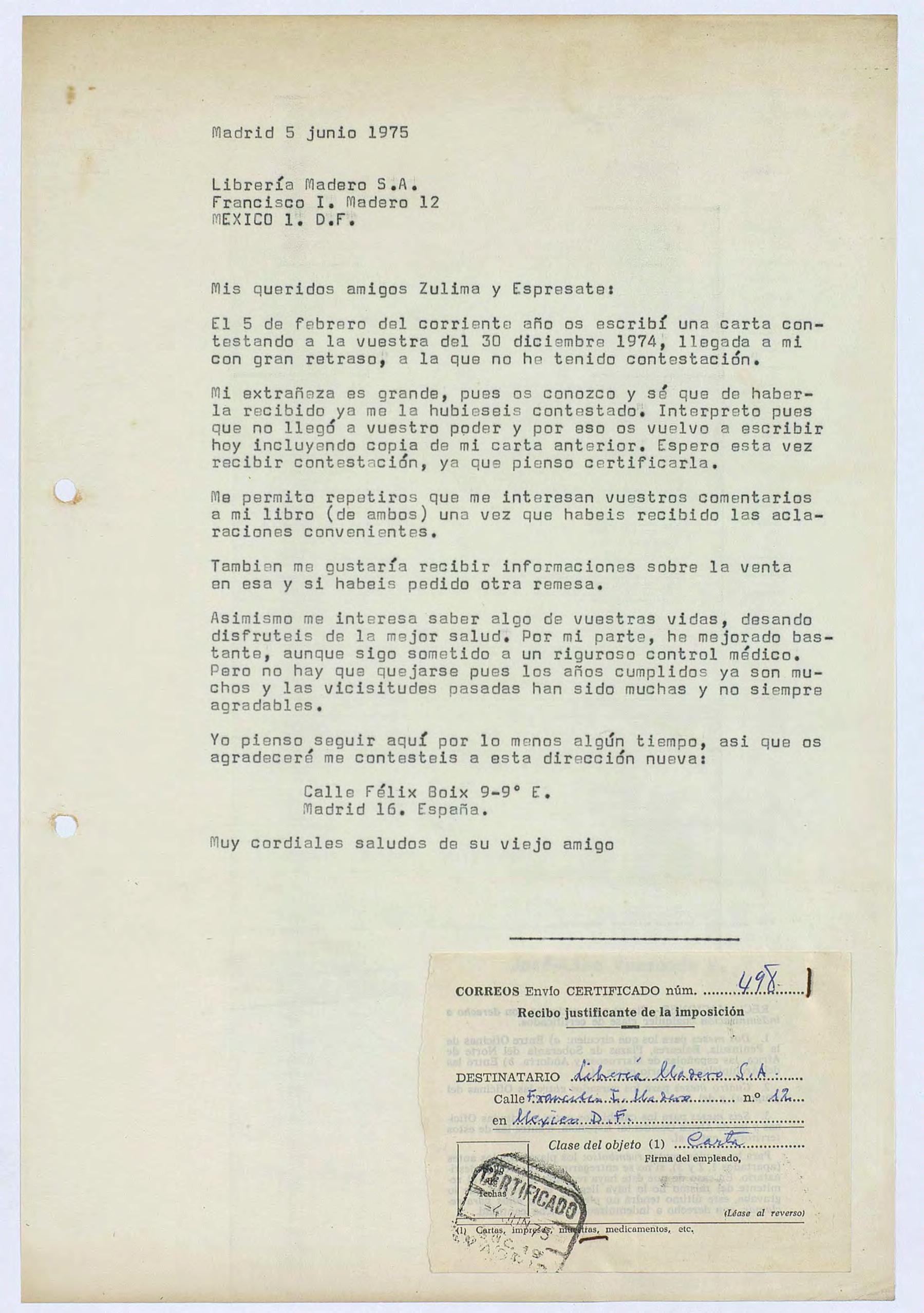 Copia de la carta remitida por José Lino Vaamonde a la Librería Madero S.A. de México D.F. Tiene grapado el justificante del envío certificado de correos.