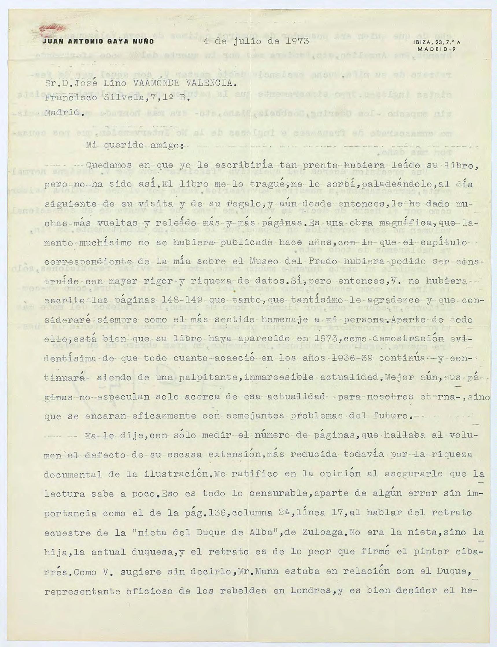 Carta mecanografiada de D. Juan Antonio Gaya Nuño dirigida al Sr. D. José Lino Vaamonde Valencia.