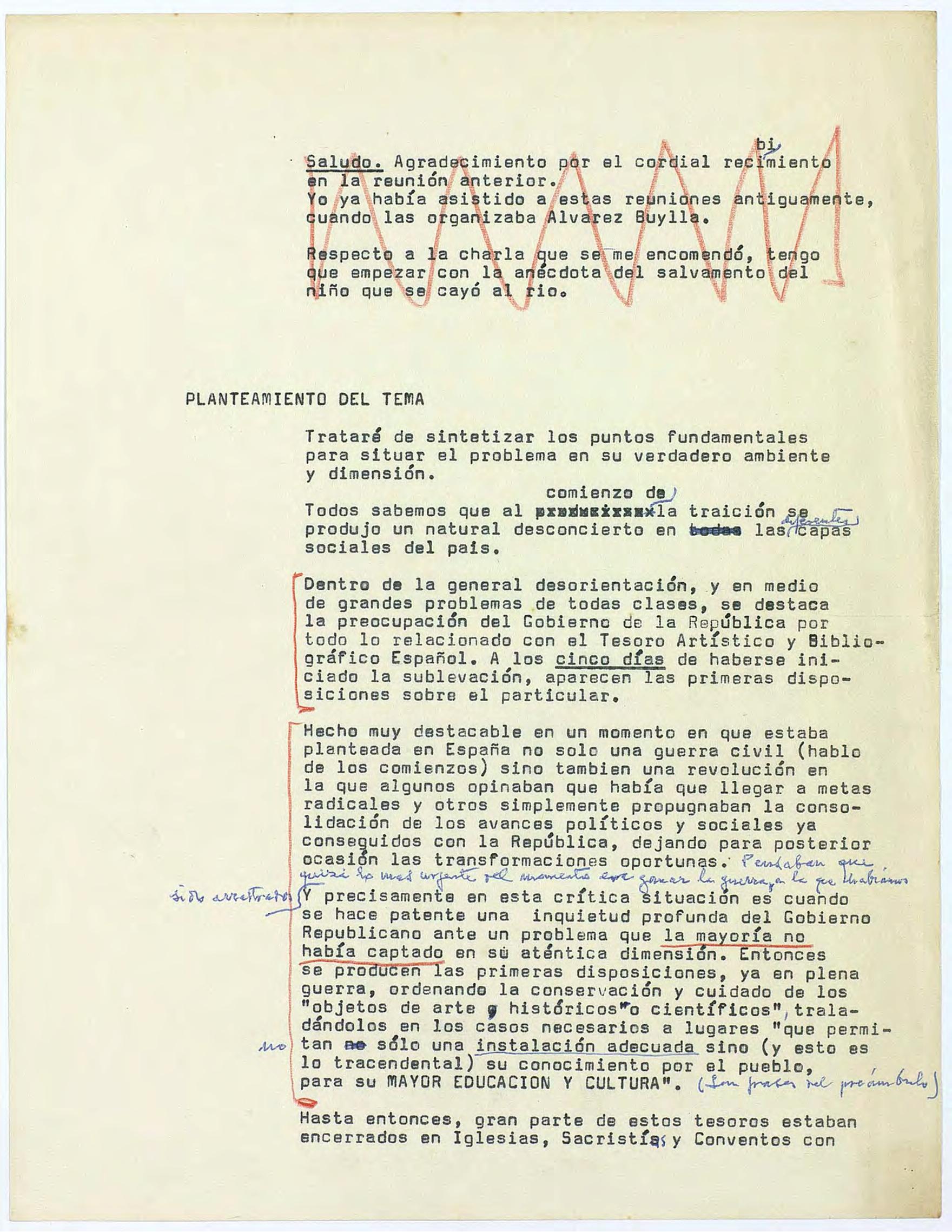 Documento mecanografiado con anotaciones manuscritas en tinta azul y lápiz rojo.