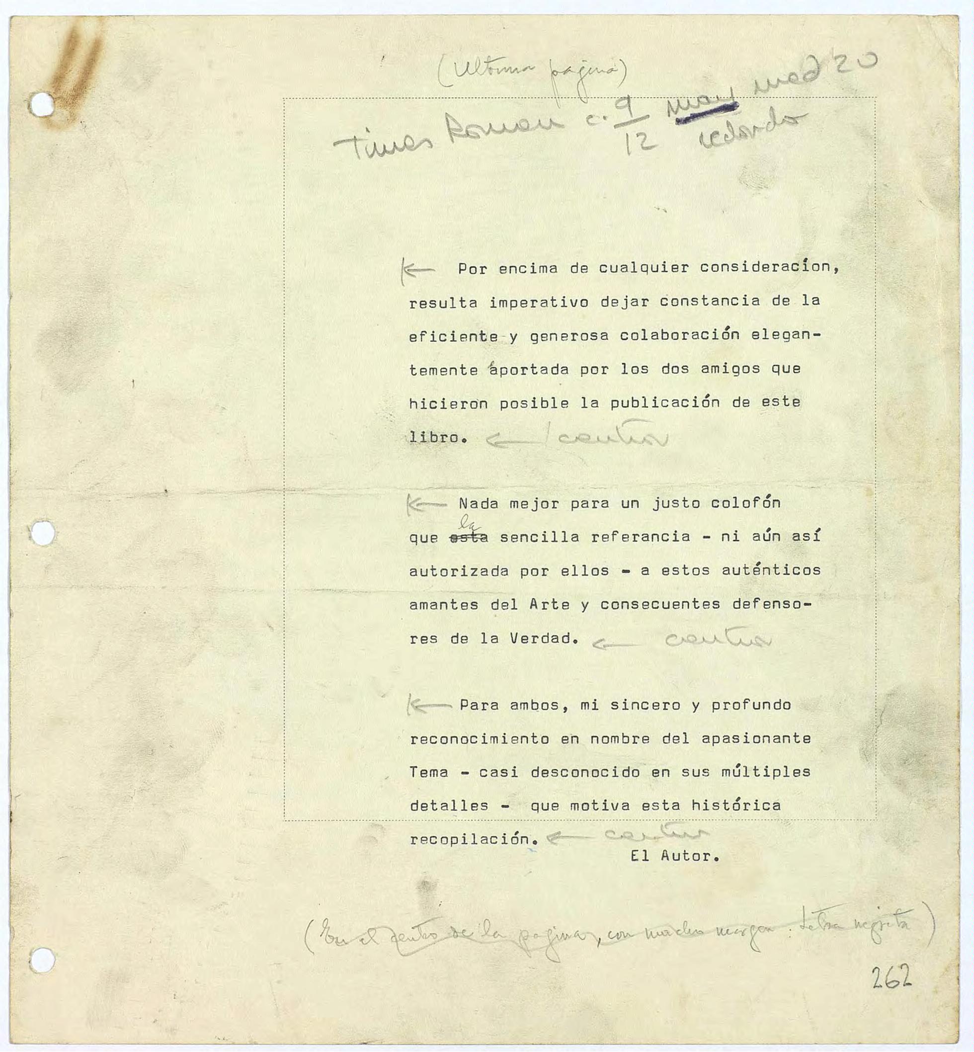 Documento mecanografiado original para la publicación. Fragmento de texto de agradecimiento de J.L.V.V. a quienes colaboraron en la publicación del libro Salvamento y Protección del Tesoro Artístico Español.