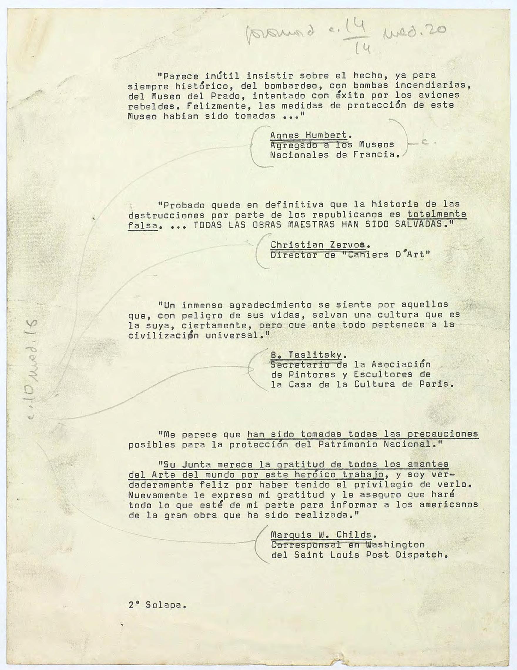 Documento mecanografiado original para la publicación. Testimonios de Agnes Humbert, Christian Zervos, B.Taslitsky y Marquis W. Childs.