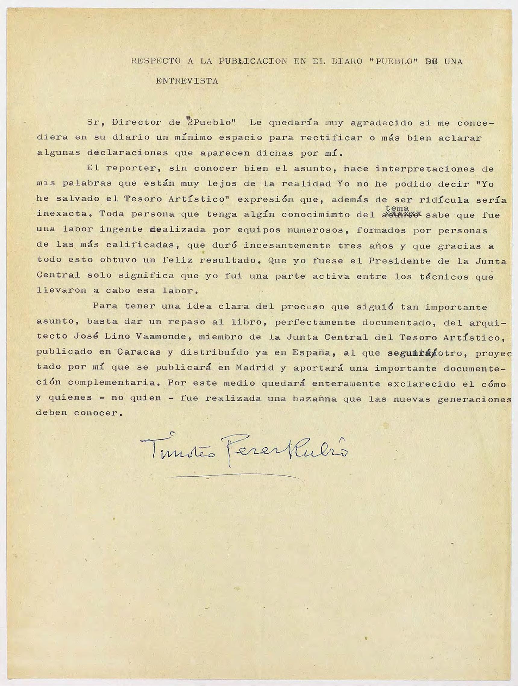 Carta mecanografiada enviada por Timoteo Pérez Rubio José Lino Vaamonde Valencia.