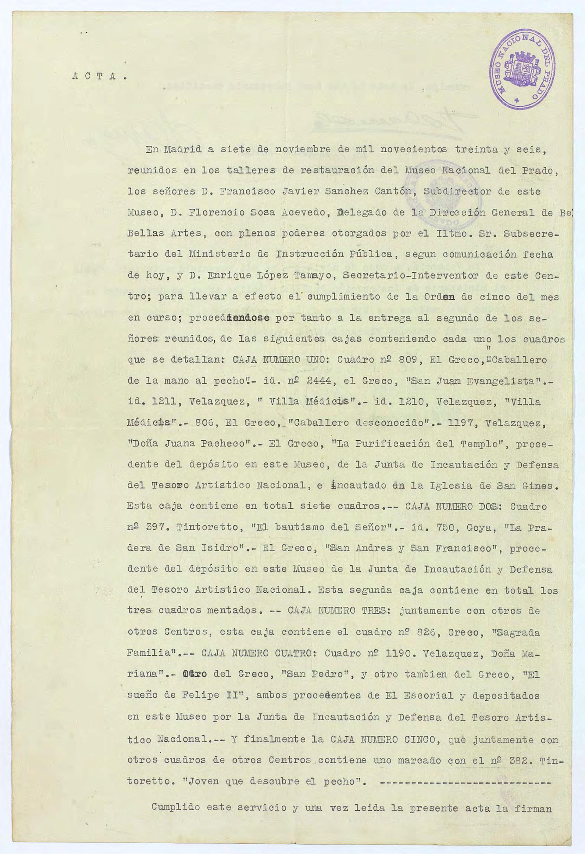 Acta original de entrega de Obras de Arte del Museo del Prado.