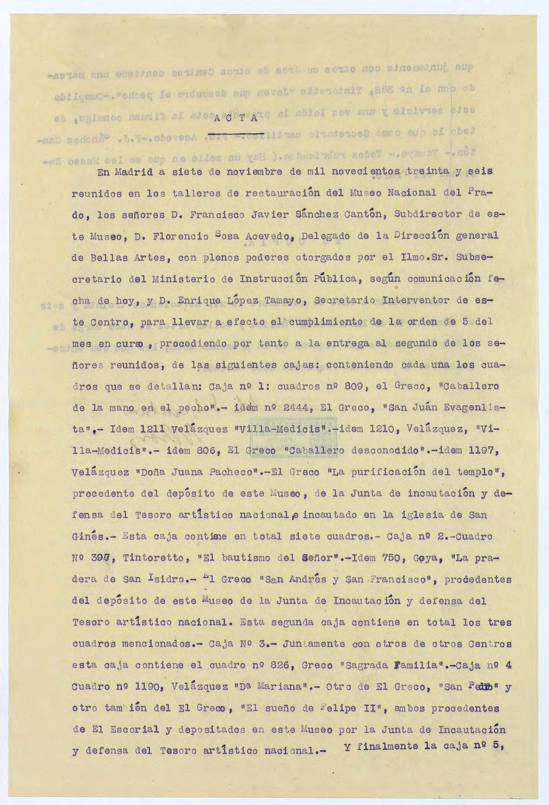 Copia original del acta de entrega de Obras de Arte del Museo del Prado.