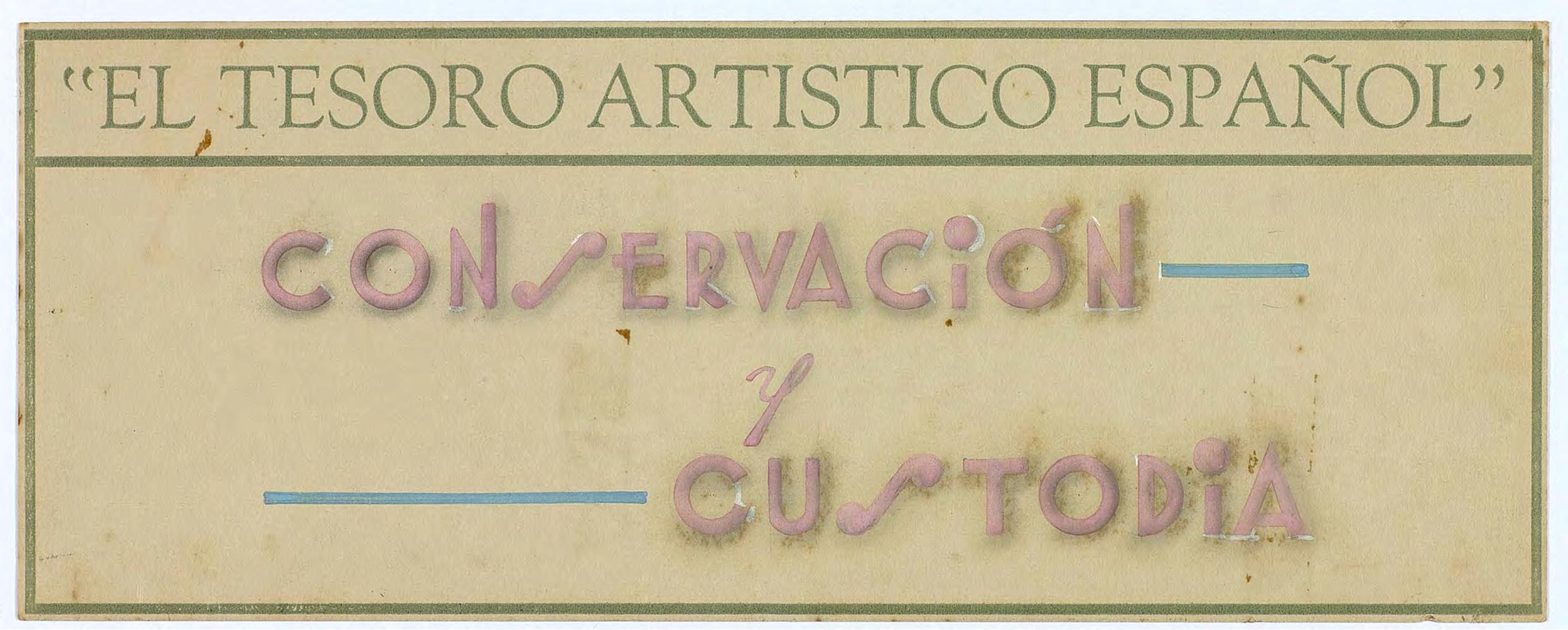 Cartela indicadora del Pabellón de España en la Exposición Internacional de París de 1937. Encabezada con: EL TESORO ARTÍSTICO ESPAÑOL. Y con el siguiente enunciado: CONSERVACIÓN Y CUSTODIA.