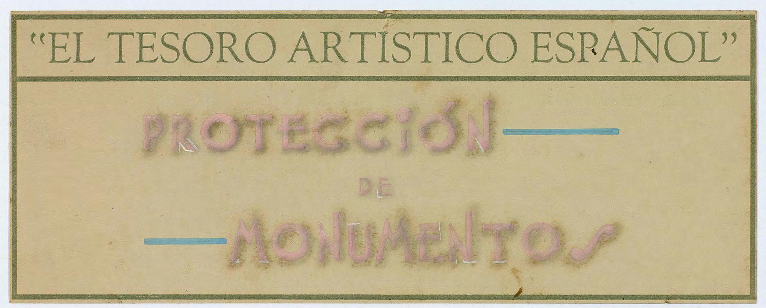Cartela indicadora del Pabellón de España en la Exposición Internacional de París de 1937. Encabezada con: EL TESORO ARTÍSTICO ESPAÑOL. Y con el siguiente enunciado: PROTECCIÓN DE MONUMENTOS.