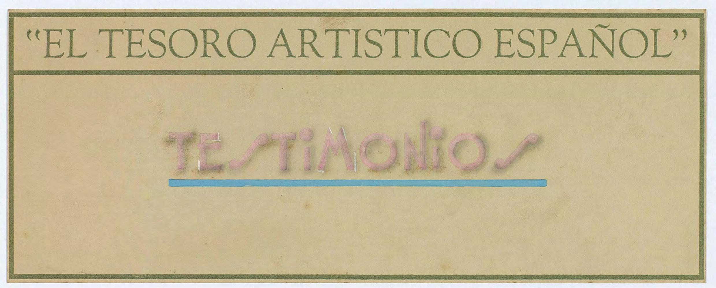 Cartela indicadora del Pabellón de España en la Exposición Internacional de París de 1937. Encabezada con: EL TESORO ARTÍSTICO ESPAÑOL. Y con el siguiente enunciado: TESTIMONIOS.
