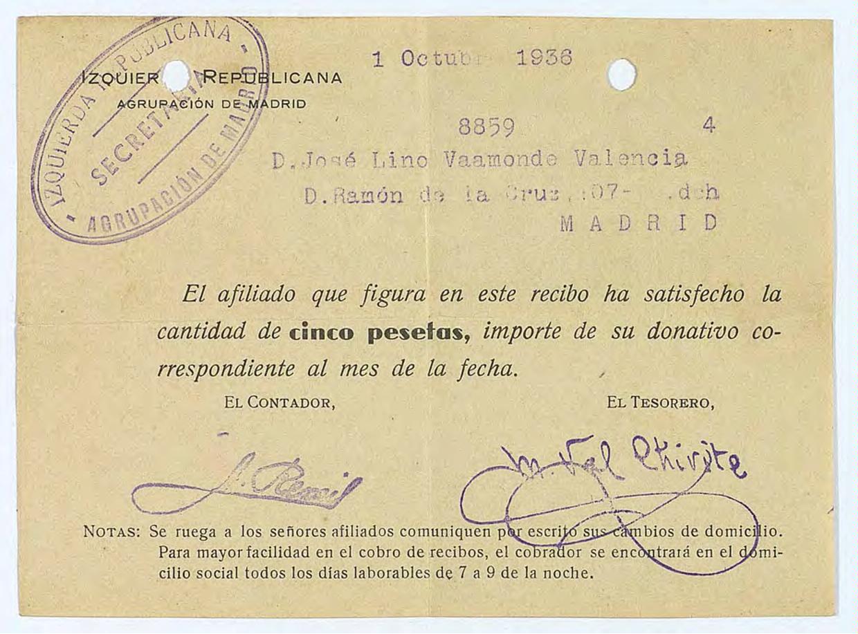 Dos recibos de pago de cuota como Afiliado a Izquierda Republicana.