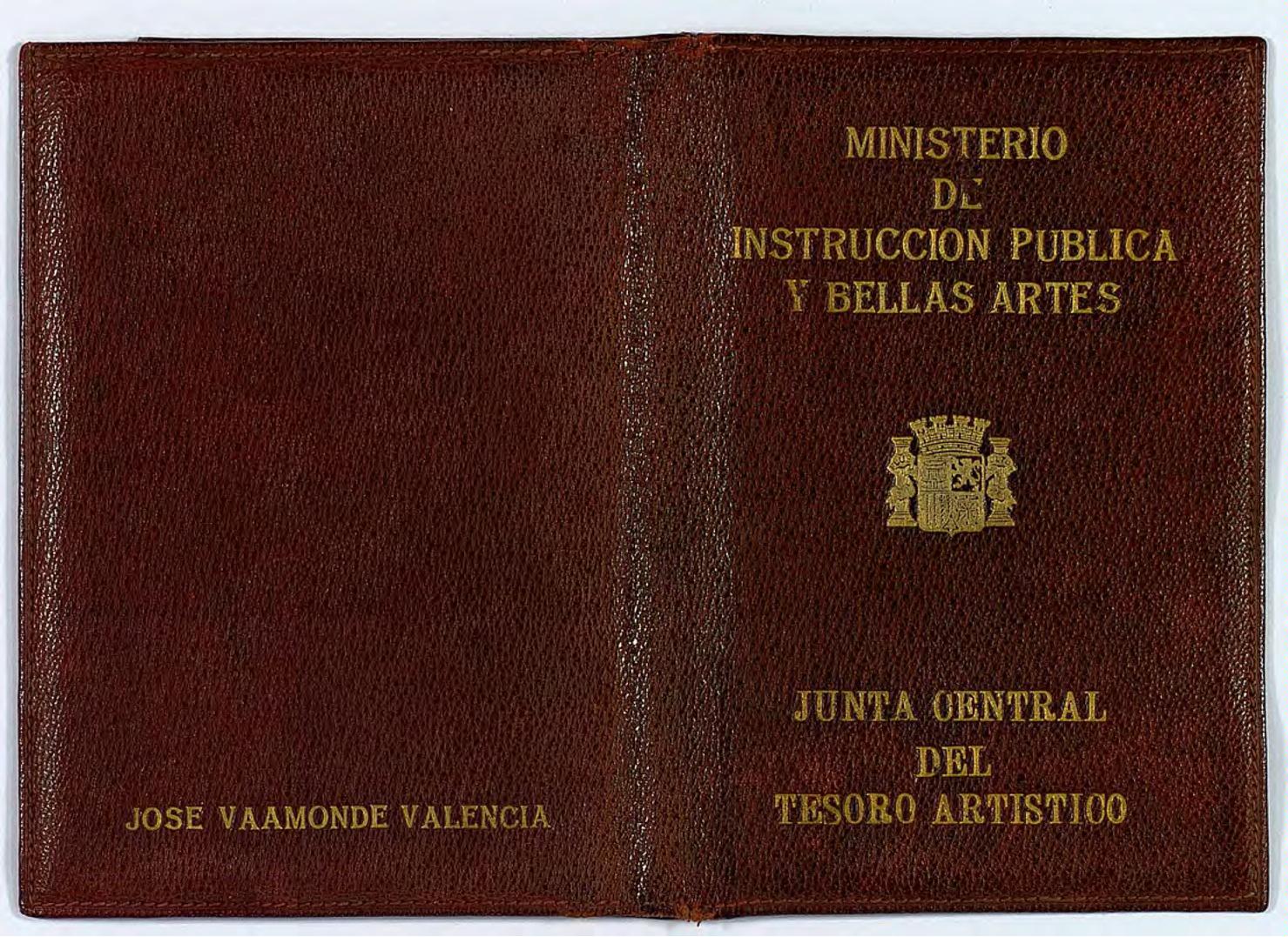 Carnet-cartera de Identificación de la Junta Central del Tesoro Artístico. En el interior: identificación como Vocal de la Junta Central del Tesoro Artístico y arquitecto, con fotografía. A la izquierda fotografía de Joselino Vaamonde hijo con la anotación manuscrita "24-XII-37, París, 9 meses". En el reverso: firma del Director General de Seguridad Interior.
