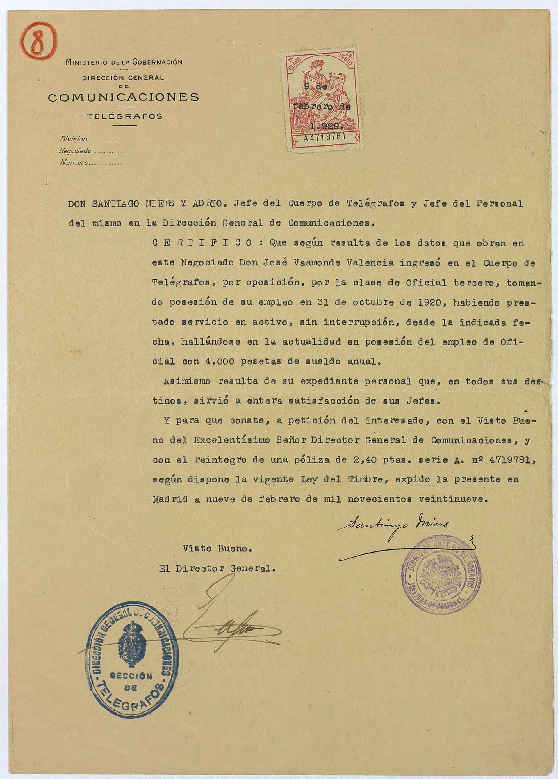 Certificado expedido por D. Santiago Miers y Adrio, Jefe del Cuerpo de Telégrafos y Jefe del Personal del mismo en la Dirección General de Comunicaciones, en el que consta que D. José Vaamonde Valencia desempeñó su trabajo en el Cuerpo de Telégrafos entre 1920 y 1929.