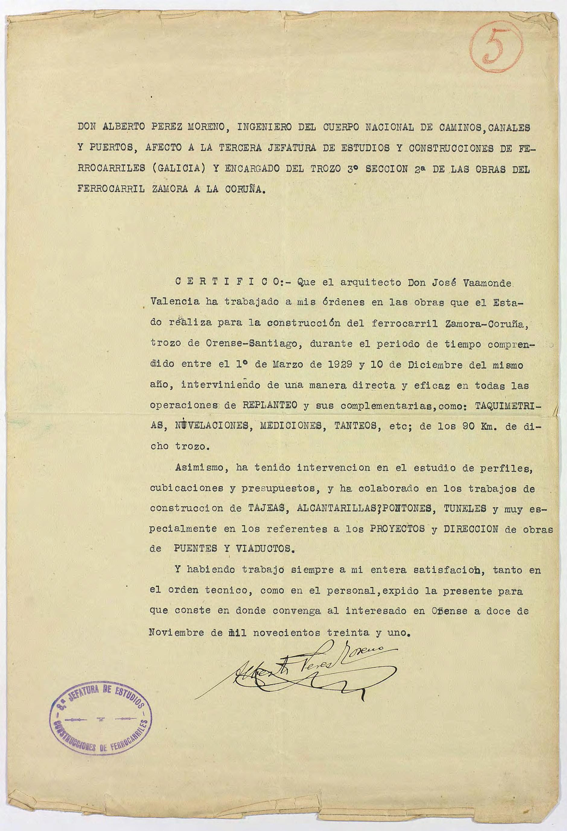 Certificado expedido por D. Alberto Pérez Moreno, Ingeniero del Cuerpo Nacional de Caminos, Canales y Puertos, en el que consta que el arquitecto D. José Vaamonde Valencia trabajó satisfactoriamente bajo sus órdenes en la construcción del tramo de ferrocarril entre Orense y Santiago durante el año 1929.