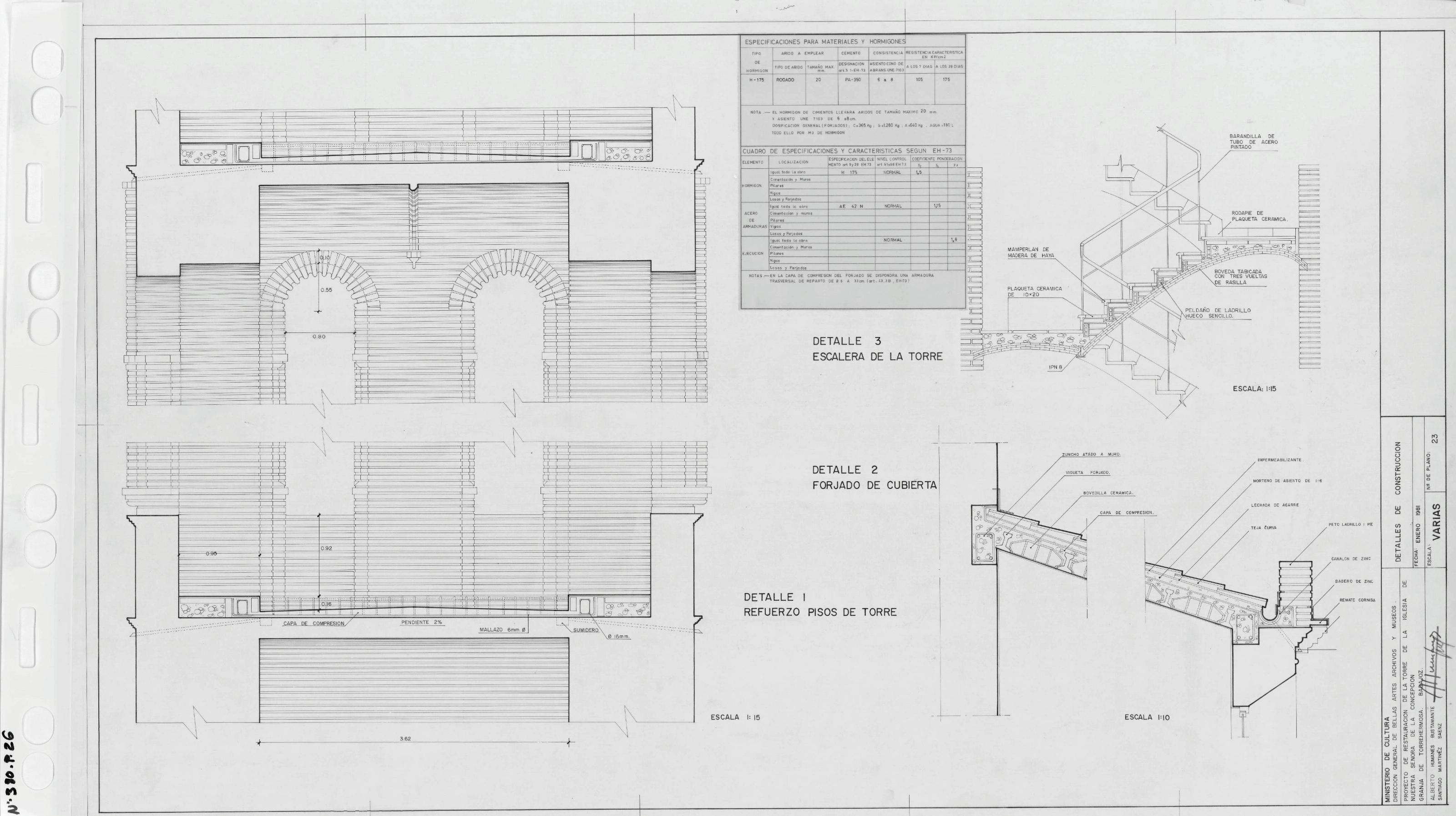 TORRE DE LA IGLESIA DE NUESTRA SEÑORA DE LA CONCEPCIONProyecto de RestauraciónGRANJA DE TORREHERMOSA (Badajoz): DETALLES DE CONSTRUCCION3 Detalles: Refuerzo pisos Torre (E: 1/15), Forjado de cubierta (E: 1/10)y Escalera de la Torre (E: 1/15)+ 1 cuadro de Especificaciones de Materiales