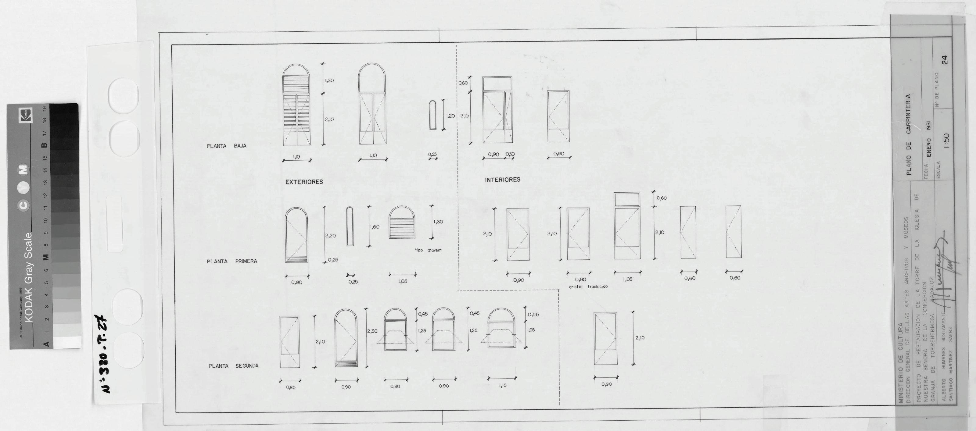 TORRE DE LA IGLESIA DE NUESTRA SEÑORA DE LA CONCEPCIONProyecto de RestauraciónGRANJA DE TORREHERMOSA (Badajoz): PLANO DE CARPINTERIAMemoria en la que se detallan tipos de abertura y medidasde los diferentes tipos.Especifica de interior o exterior así como el piso en que se encuentra