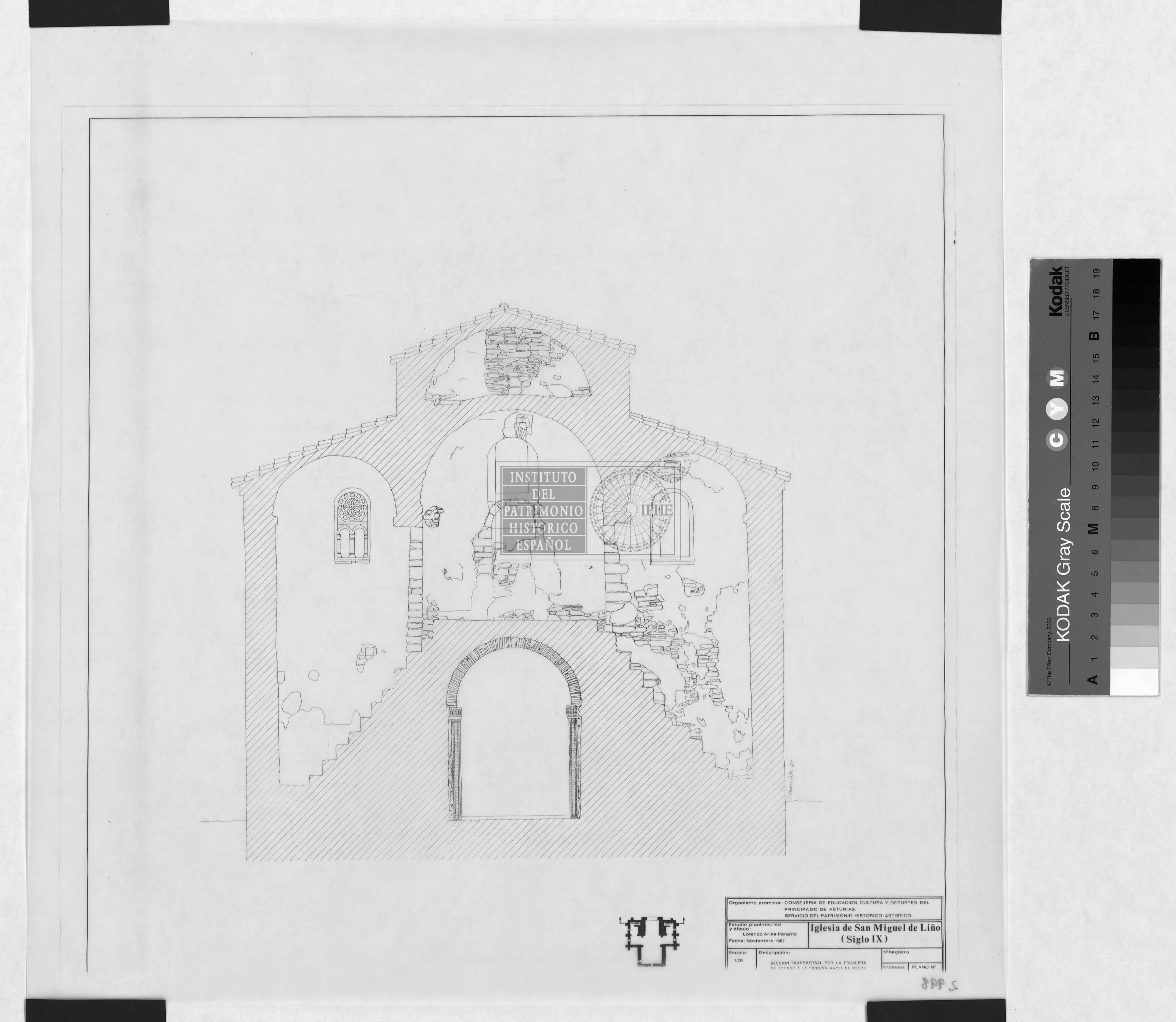 IGLESIA DE SAN MIGUEL DE LIÑO: SECCION TRANSVERSAL POR LA ESCALERA DE ACCESO A LA TRIBUNA HACIA EL OESTE (PLANO GRANDE)