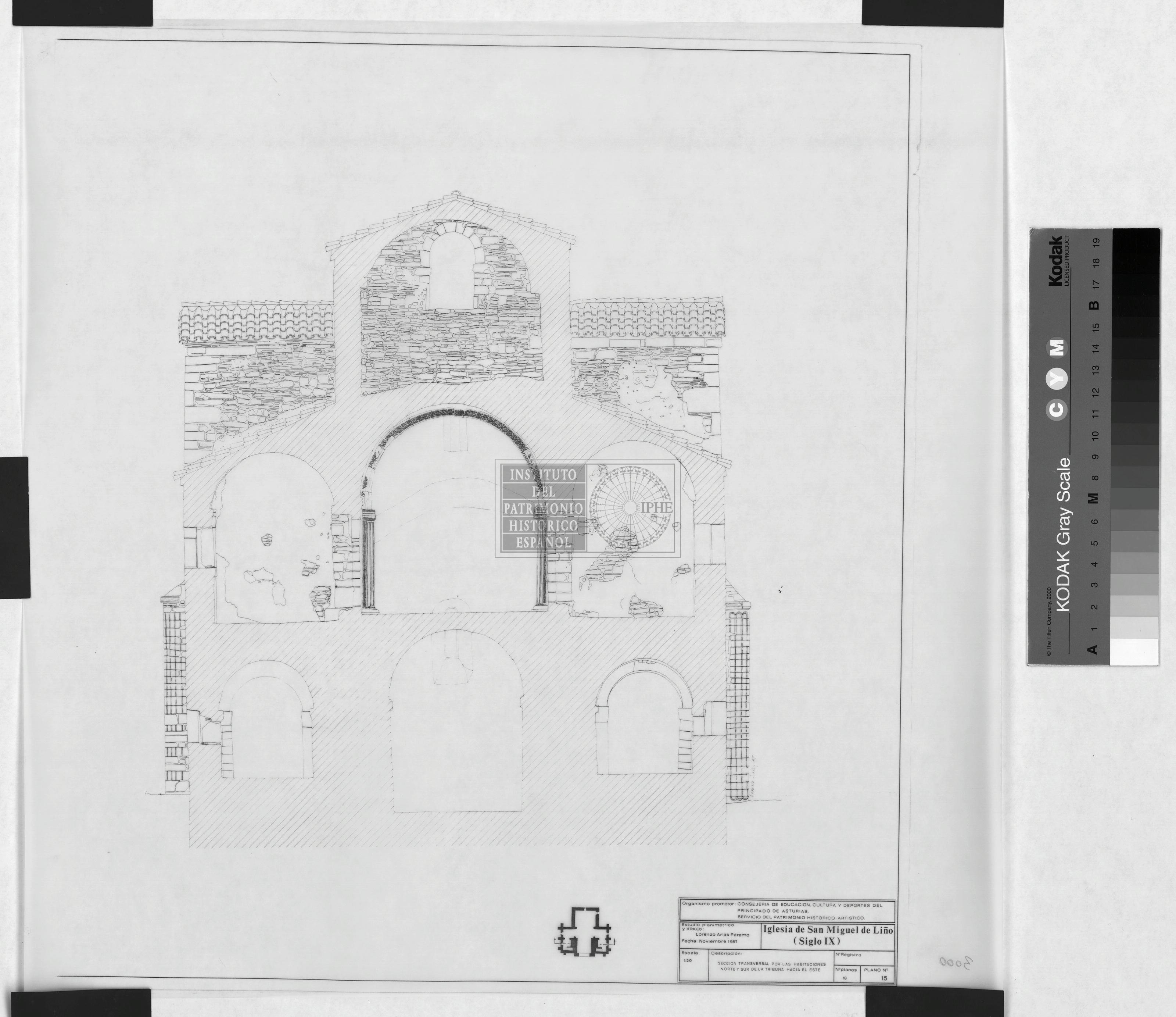 IGLESIA DE SAN MIGUEL DE LIÑO: SECCION TRANSVERSAL POR LAS HABITACIONES NORTE Y SUR DE LA TRIBUNA HACIA EL ESTE (PLANO GRANDE)