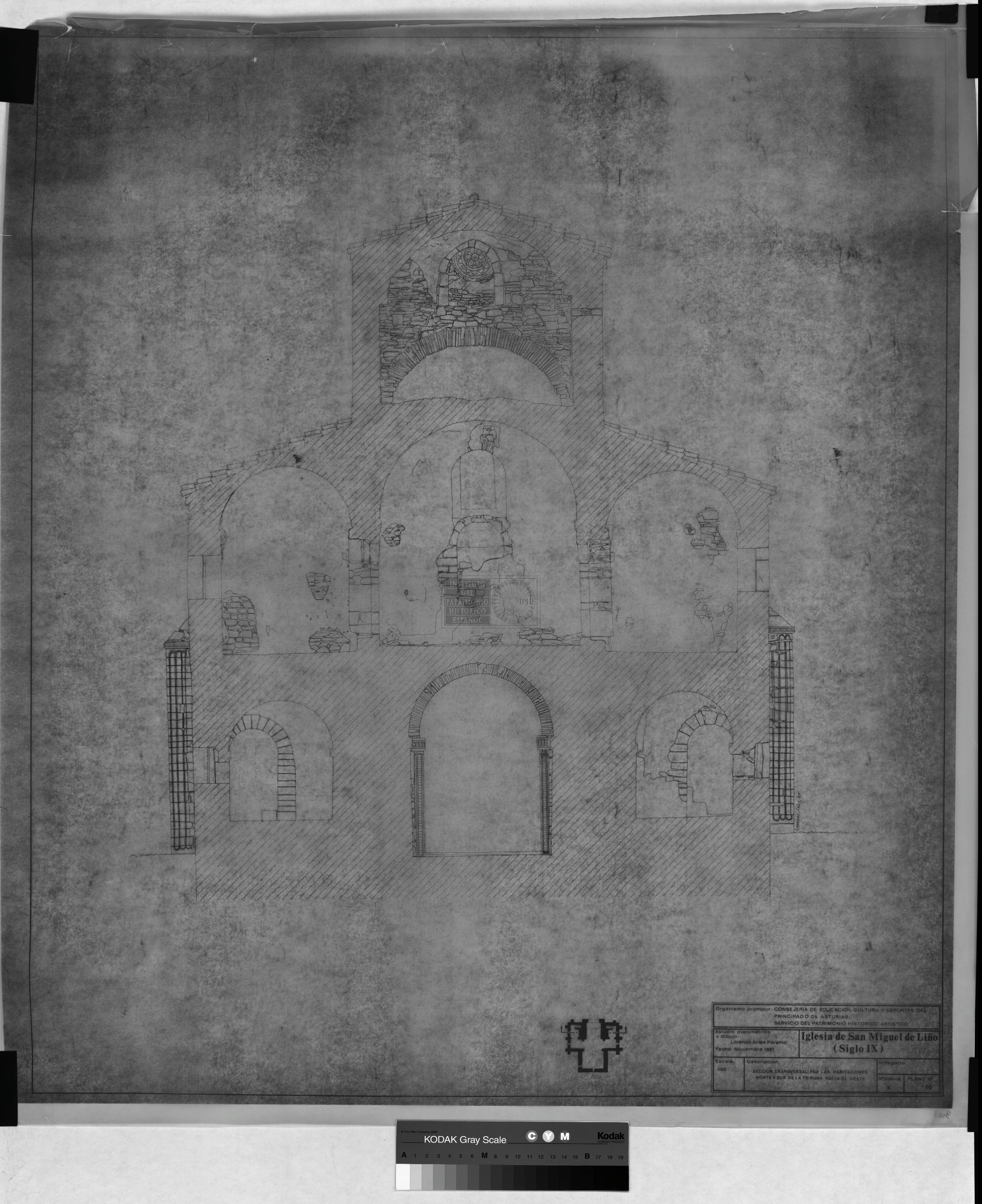 IGLESIA DE SAN MIGUEL DE LIÑO: SECCION TRANSVERSAL POR LAS HABITACIONES NORTE Y SUR DE LA TRIBUNA HACIA EL OESTE (PLANO GRANDE)