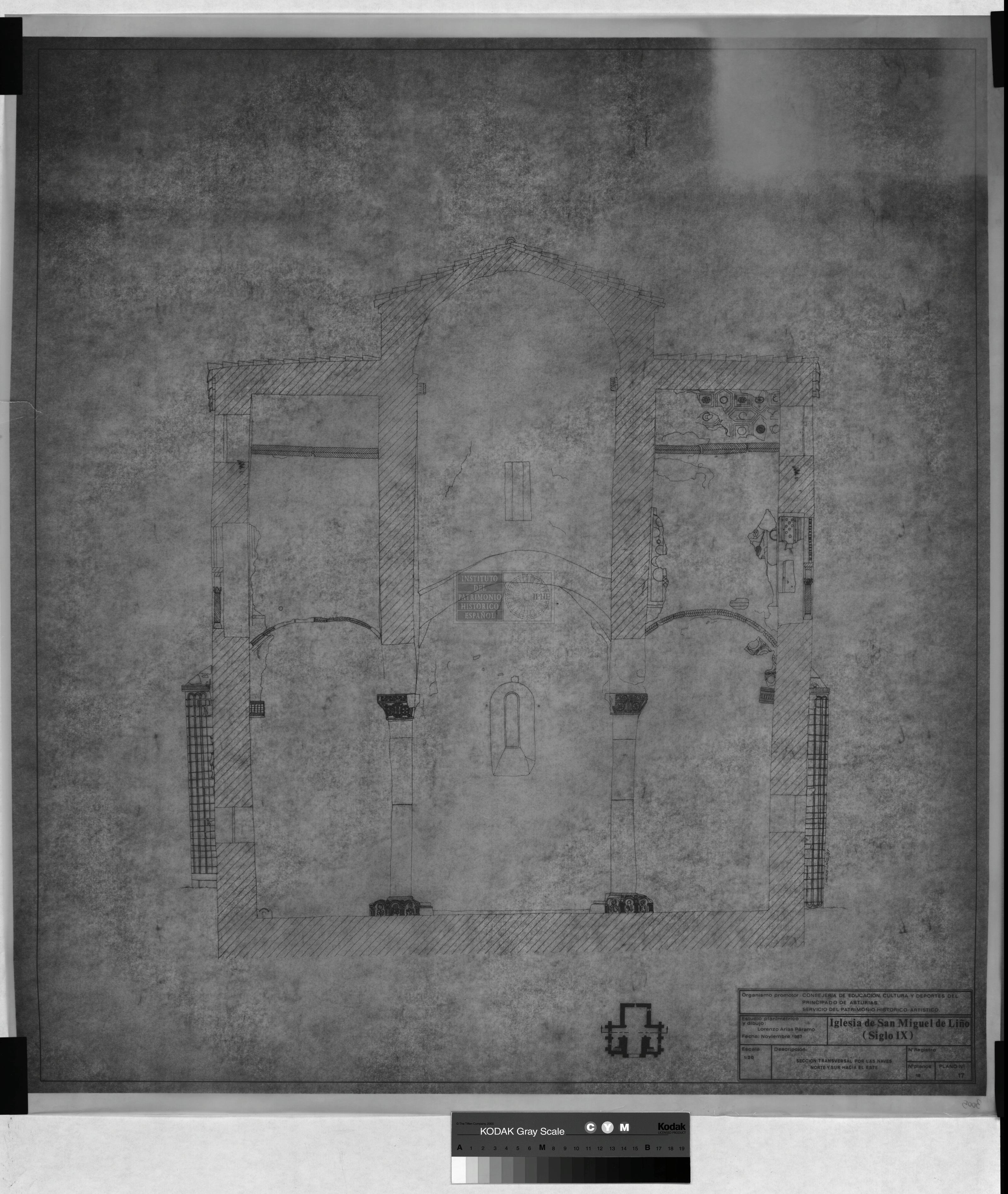 IGLESIA DE SAN MIGUEL DE LIÑO: SECCION TRANSVERSAL POR LAS NAVES NORTE Y SUR HACIA EL ESTE (PLANO GRANDE)