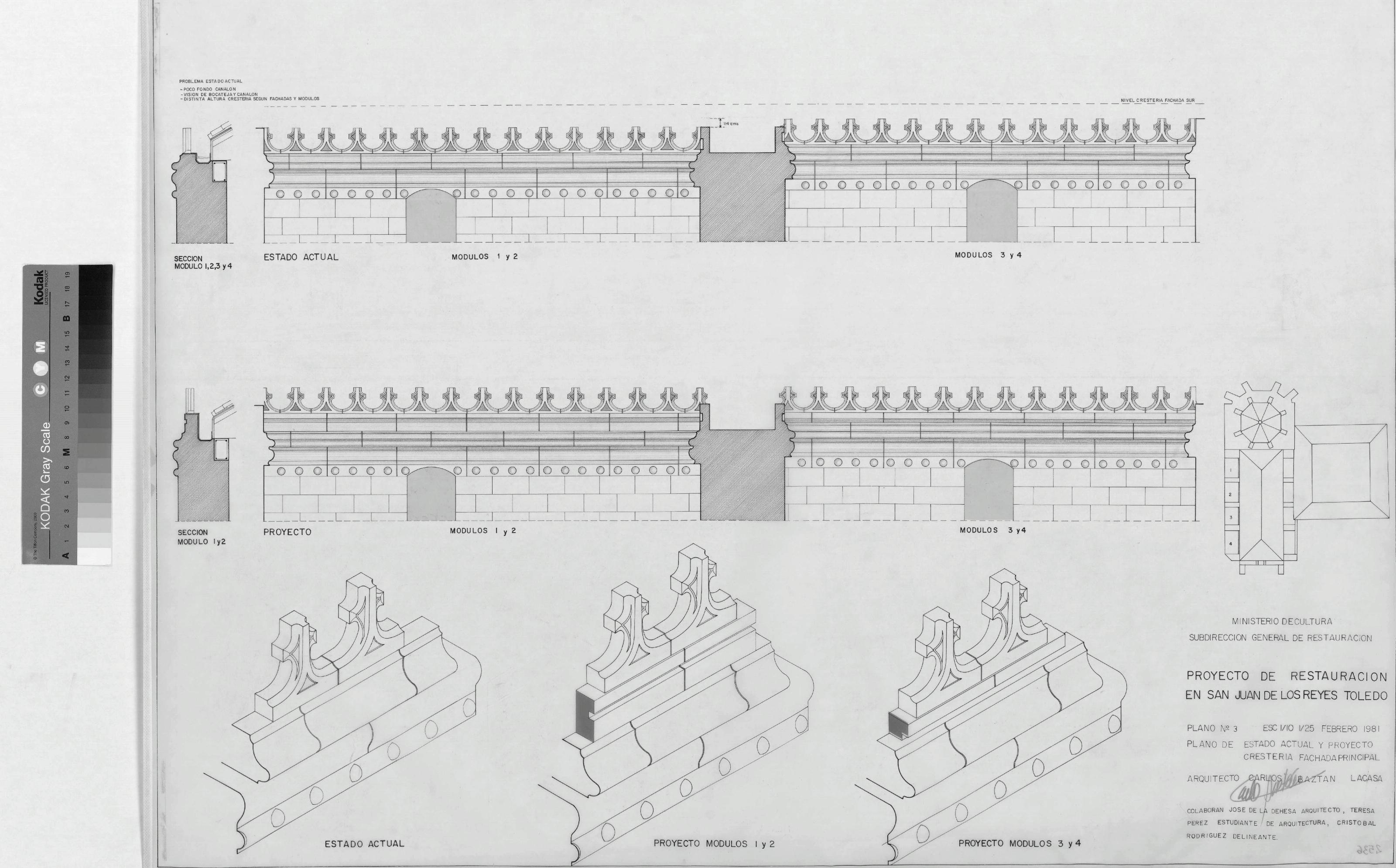 PROYECTO DE REPARACION DE CUBIERTA Y OBRAS VARIAS EN SAN JUAN DE LOS REYES: PLANO ESTADO ACTUAL Y PROYECTO CRESTERIA FACHADA PRINCIPAL